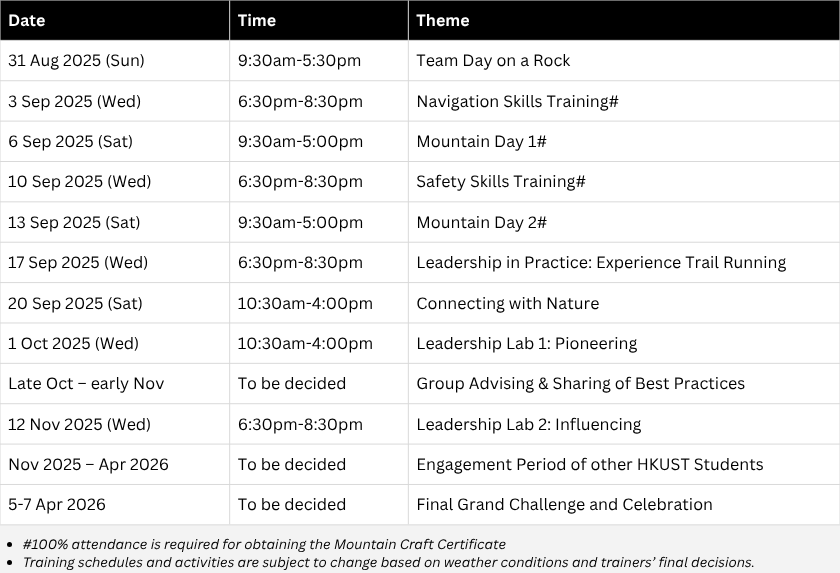 - Gain Practical Experience: Engage with and support HKUST students in at least 4 outdoor sessions.